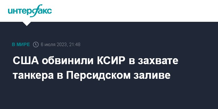 Москва. 6 июля. INTERFAX.RU - США обвинили Корпус стражей Исламской революции (КСИР) Ирана в захвате танкера, шедшего под флагом Танзании в международных водах в Персидском заливе. Об этом сообщают западные СМИ со ссылкой на Пятый флот ВМС США.