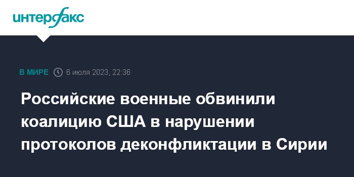 Москва. 6 июля. INTERFAX.RU - Военные РФ обвинили возглавляемую США коалицию в нарушении границ района в Сирии, закрытого для полетов из-за российско-сирийских авиационных учений.