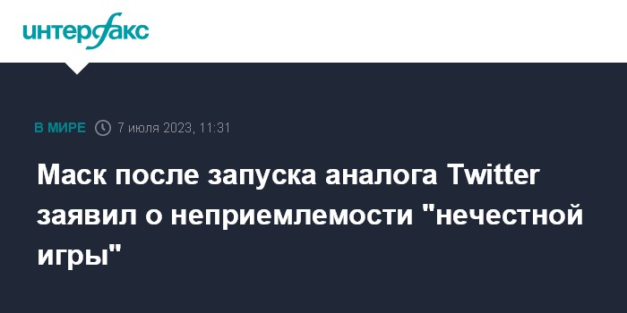 Москва. 7 июля. INTERFAX.RU - Владелец Twitter Илон Маск после запуска американской компанией Meta (признана в РФ экстремистской организацией и запрещена) аналогичной его сервису платформы Threads указал на неприемлемость "нечестной игры".