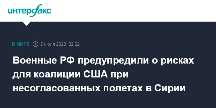 Москва. 7 июля. INTERFAX.RU - Российские военные заявили о рисках для авиации американской коалиции в Сирии в случае несогласованных полетов.