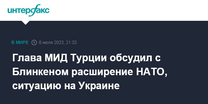 Москва. 8 июля. INTERFAX.RU - Министр иностранных дел Турции Хакан Фидан обсудил с американским коллегой Энтони Блинкеном саммит НАТО в Вильнюсе, Украину и другие международные вопросы, сообщает в субботу агентство "Анадолу".