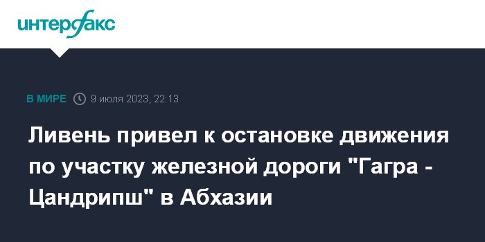 Москва. 9 июля. INTERFAX.RU - Железнодорожный участок "Гагра - Цандрипш" в Республике Абхазия закрыт из-за неблагоприятных погодных условий, пассажиров поездов доставят автобусами до станции Цандрипш, сообщает в воскресенье официальный телеграм-канал РЖД.