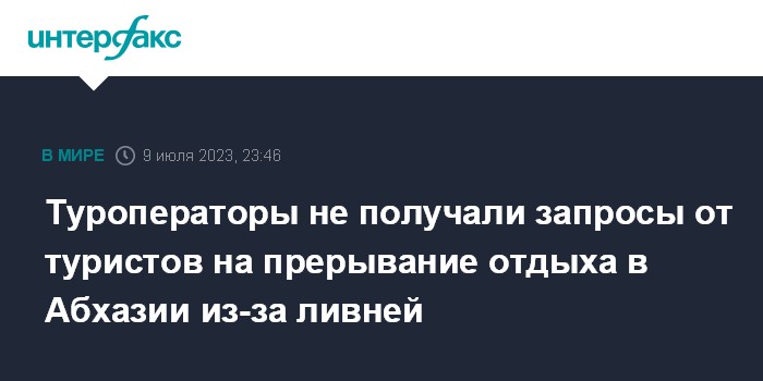 Москва. 9 июля. INTERFAX.RU - Турпоператоры не получали запросов от российских туристов на прерывание отдыха в Абхазии из-за сильных ливней в республике, сообщает Ассоциация туроператоров России (АТОР).