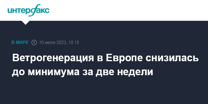 Москва. 10 июля. INTERFAX.RU - Ветрогенерация в Европе в воскресенье - один из самых жарких дней этого летнего сезона - опустилась до минимального значения за последние полмесяца. Первые дни наступившей недели прогноз относительно скорости ветра в регионе весьма нестабильный.
