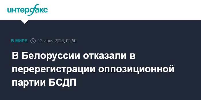 Москва. 12 июля. INTERFAX.RU - Минюст Белоруссии отказал в перерегистрации основанной в 1991 году оппозиционной Белорусской социал-демократической партии (Грамада, БСДП), сообщил в соцсети лидер партии Игорь Борисов.