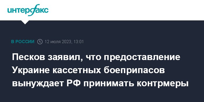 Москва. 12 июля. INTERFAX.RU - Предоставление Соединенными Штатами Украине кассетных боеприпасов вынуждает Россию принимать контрмеры, заявил пресс-секретарь президента РФ Дмитрий Песков.