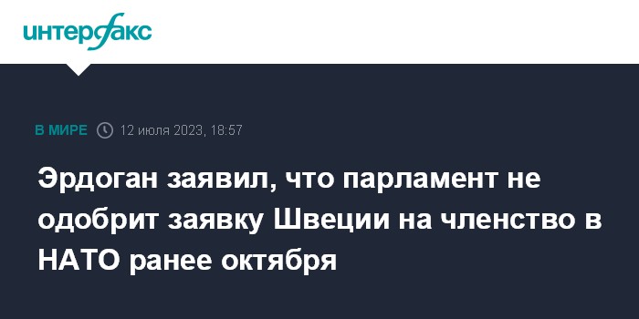 Москва. 12 июля. INTERFAX.RU - Президент Турции Реджеп Тайип Эрдоган заявил в среду, что турецкий парламент не ратифицирует протокол о присоединении Швеции к НАТО ранее октября, сообщает Associated Press.