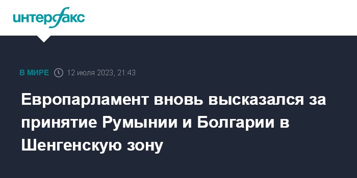 Москва. 12 июля. INTERFAX.RU - Депутаты Европарламента (ЕП) призвали Совет ЕС одобрить присоединение Румынии и Болгарии к Шенгенской зоне свободного передвижения до конца 2023 года.
