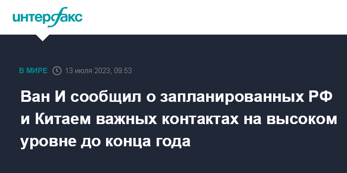 Москва. 13 июля. INTERFAX.RU - Россия и Китай планируют ряд важных контактов на высоком уровне во второй половине 2023 года, сообщил в четверг глава канцелярии комиссии ЦК КПК по иностранным делам Ван И.