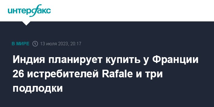 Москва. 13 июля. INTERFAX.RU - Совет по оборонным закупкам кабмина Индии одобрил предложение закупить у Франции 26 истребителей Rafale и три дизельных подводных лодки типа "Скорпен", сообщают в четверг западные СМИ.