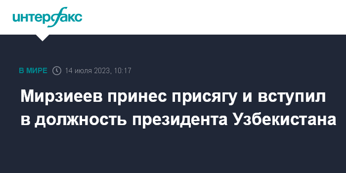 Москва. 14 июля. INTERFAX.RU - Шавкат Мирзиеев в пятницу вступил в должность президента Узбекистана на совместном заседании Законодательной палаты и Сената Олий Мажлиса (нижней и верхней палаты парламента).