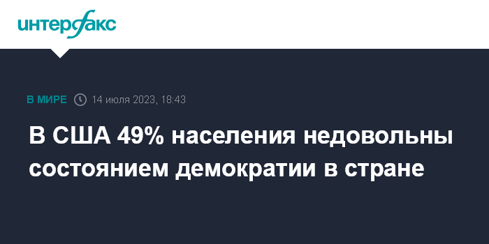 Москва. 14 июля. INTERFAX.RU - Практически половина опрошенных американцев полагает, что государственные учреждения США не работают так, как надо, показал социологический опрос, проведенный Associated Press-NORC. 49% респондентов считают, что демократия в стране не работает хорошо.
