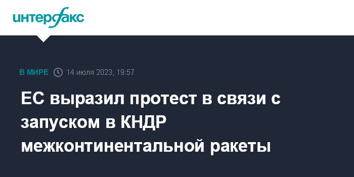 "ЕС решительно осуждает запуск Корейской Народно-Демократической Республикой еще одной межконтинентальной баллистической ракеты 12 июля, в четвертый раз в этом году. КНДР продолжает демонстрировать свое намерение разрабатывать средства доставки оружия массового уничтожения. Эти действия угрожают международному миру и безопасности", - говорится в коммюнике.