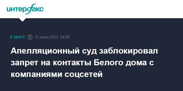 Москва. 15 июля. INTERFAX.RU - Федеральный апелляционный суд США временно заблокировал решение судьи штата Луизиана Терри Даути, которое запрещало сотрудникам администрации президента и правительственных ведомств общение с компаниями социальных сетей, сообщает телеканал CNN.