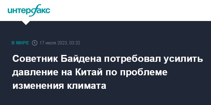 Москва. 17 июля. INTERFAX.RU - Необходимо увеличить давление на Китай, чтобы он нарастил усилия, направленные на сокращение выбросов и борьбу с изменением климата, заявил советник президента США по нацбезопасности Джейк Салливан.