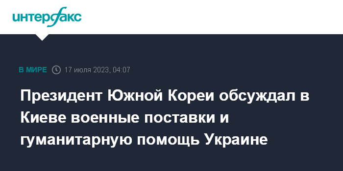 Москва. 17 июля. INTERFAX.RU - Президент Южной Кореи Юн Сок Ель в ходе необъявленного визита в Киев обсуждал вопросы предоставления Украине гуманитарной помощи, а также военные поставки, сообщает агентство "Ренхап".