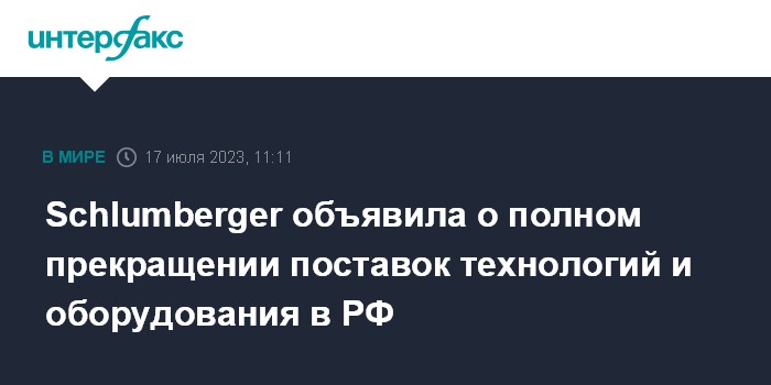 Москва. 17 июля. INTERFAX.RU - Американская нефтесервисная компания SLB (ранее известная как Schlumberger) объявила о полном прекращении экспорта технологий и оборудования в Россию, говорится в заявлении, размещенном на официальном сайте компании.