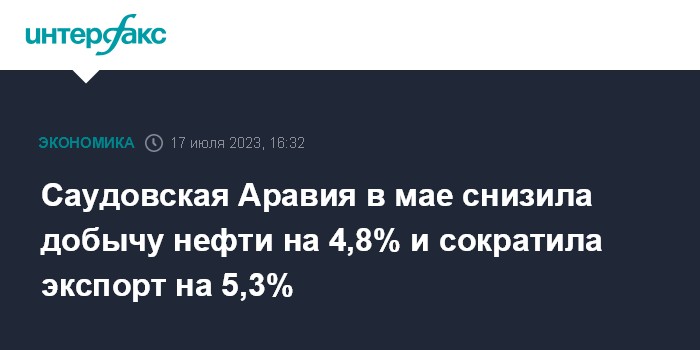 Москва. 17 июля. INTERFAX.RU - Саудовская Аравия в мае ощутимо снизила добычу и экспорт нефти относительно предыдущего месяца, сообщает сайт Joint Organization Data Initiative (JODI).