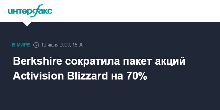 Москва. 18 июля. INTERFAX.RU - Инвестфирма американского миллиардера Уоррена Баффета Berkshire Hathaway сократила размер пакета акций разработчика видеоигр Activision Blizzard на 70%.