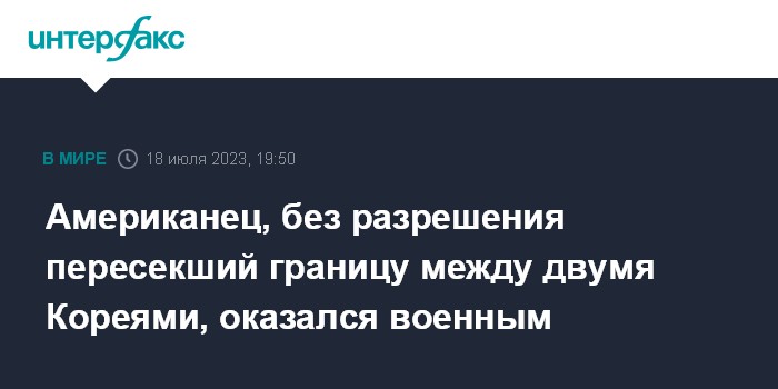 Москва. 18 июля. INTERFAX.RU - Гражданин США, который ранее во вторник пересек демаркационную линию на границе двух Корей и, вероятно, был задержан в КНДР, является американским военнослужащим, сообщает CBS News со ссылкой на неназванных официальных лиц.