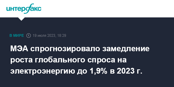 Москва. 19 июля. INTERFAX.RU - Темпы роста мирового спроса на электроэнергию в 2023 году снизятся из-за последствий энергетического кризиса и экономического спада в странах с развитой экономикой. Об этом говорится в отчете Международного энергетического агентства (МЭА).