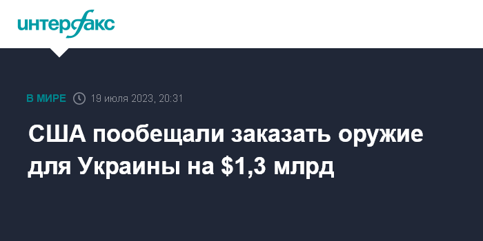 Москва. 19 июля. INTERFAX.RU - США выделяют еще $1,3 млрд на заказ вооружения для Украины, сообщает в среду Пентагон.