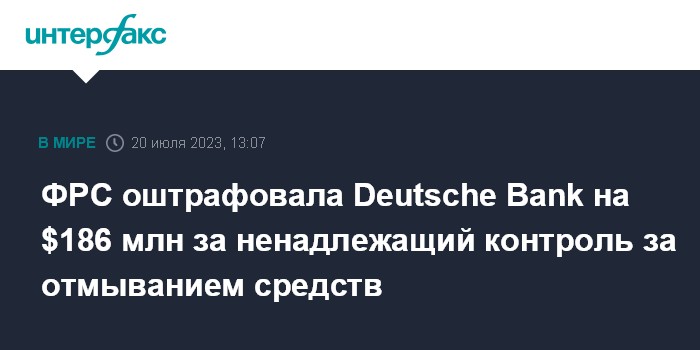 Москва. 20 июля. INTERFAX.RU - Федеральная резервная система (ФРС) США оштрафовала германский Deutsche Bank на $186 млн за невыполнение данных ранее обязательств улучшить меры противодействия отмыванию средств и нарушению санкций.
