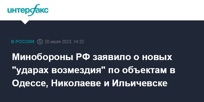 Москва. 20 июля. INTERFAX.RU - Российские военные сообщили, что высокоточным ударом уничтожили цеха производства и места хранения безэкипажных катеров в районах городов Одесса и Ильичевск Одесской области, а также объекты топливной инфраструктуры и склады боеприпасов в районе Николаева.