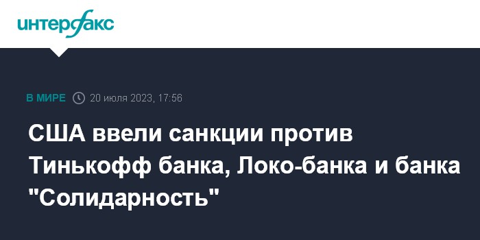 Москва. 20 июля. INTERFAX.RU - США ввели блокирующие санкции против пяти российских кредитных организаций, в том числе Тинькофф банка, Локо-банка и банка "Солидарность", сообщил американский Минфин.