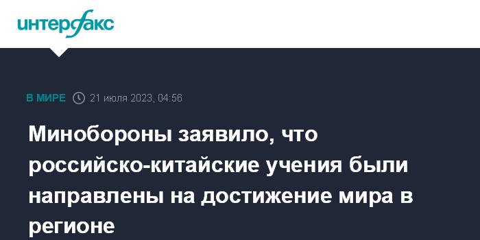 Москва. 21 июля. INTERFAX.RU - Целью российско-китайских военно-морских учений в акватории Японского моря "Север/Взаимодействие-2023", которые проводятся в соответствии с планом международного военного сотрудничества, является поддержание стабильности и мира в Азиатско-Тихоокеанском регионе.