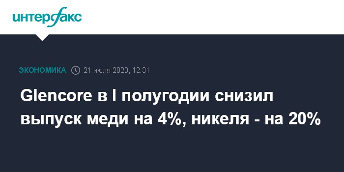 Москва. 21 июля. INTERFAX.RU - Glencore в I полугодии снизил выпуск меди из собственного сырья на 4% к аналогичному периоду 2022 года, до 488 тысяч тонн, цинка - на 10%, до 434,7 тысячи тонн, сообщила компания.
