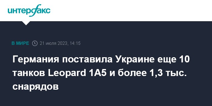 Москва. 21 июля. INTERFAX.RU - Германия направила Украине дополнительно 10 танков Leopard 1A5, порядка 1,3 тыс. снарядов калибра 155 мм, а также более 2 тыс. дымовых боеприпасов, сообщило Минобороны ФРГ в пятницу.