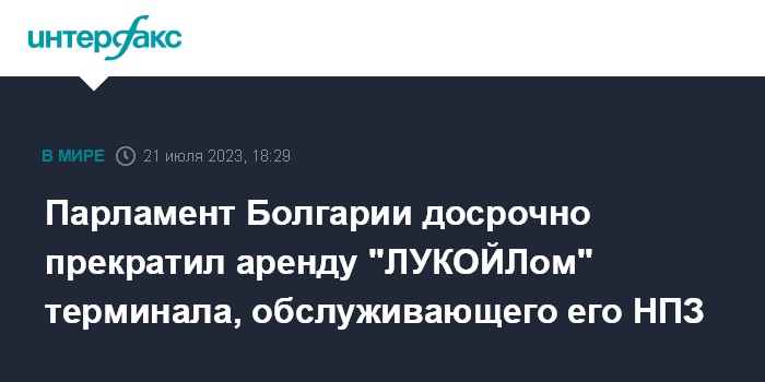 Москва. 21 июля. INTERFAX.RU - Парламент Болгарии проголосовал за досрочное прекращение 35-летней аренды "ЛУКОЙЛом" терминала, обслуживающего нефтеперерабатывающий завод российской компании у Черного моря, пишет агентство Bloomberg.