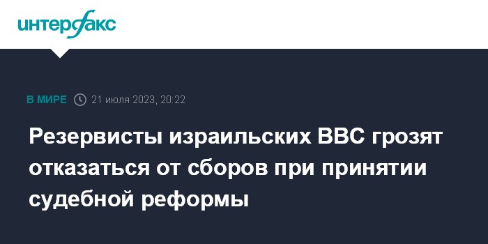Москва. 21 июля. INTERFAX.RU - Военнослужащие запаса ВВС ЦАХАЛ подписали письмо, в котором заявили об отказе прохождения сборов в случае принятия правительством Израиля масштабной судебной реформы, сообщают в пятницу израильские СМИ.