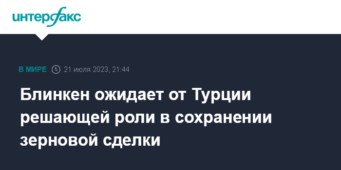 Москва. 21 июля. INTERFAX.RU - Госсекретарь США Энтони Блинкен выразил надежду, что Турция поспособствует возвращению всех участников к выполнению черноморской зерновой инициативы.