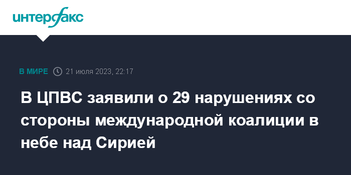Москва. 21 июля. INTERFAX.RU - Российские военные заявили о 21 нарушении протоколов о деконфликтации в Сирии беспилотниками возглавляемой США международной коалиции, а также о восьми нарушениях сирийского воздушного пространства истребителями F-16 и "Тайфун".