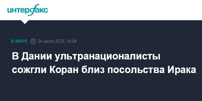 Москва. 24 июля. INTERFAX.RU - Активисты ультранационалистической организации "Датские патриоты" сожгли Коран перед посольством Ирака в Копенгагене, передают в понедельник западные СМИ.