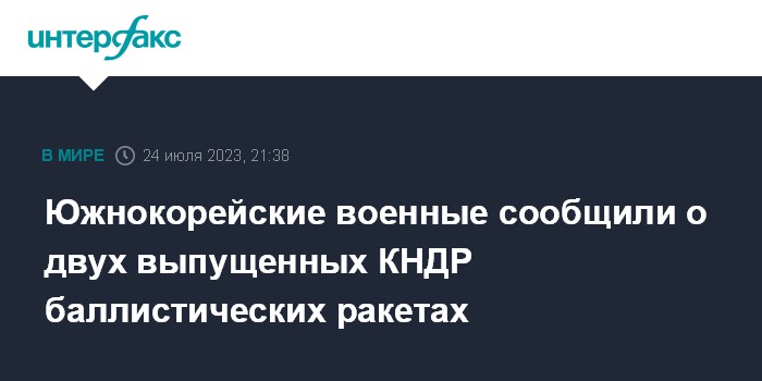 "Наши военные выявили две баллистические ракеты, выпущенные Северной Кореей из районов близ Пхеньяна в сторону Японского моря 24 июля в 23:55 по местному времени (17:55 по московскому времени) и 25 июля в полночь по местному времени (18:00 по московскому времени)", - приводит агентство выдержки из заявления JCS.