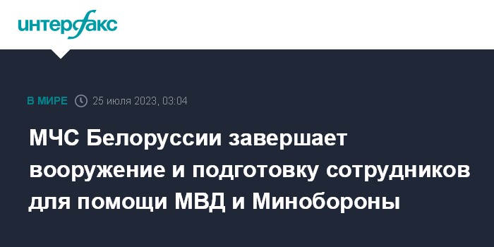 Москва. 25 июля. INTERFAX.RU - Министерство по чрезвычайным ситуациям Белоруссии завершает вооружение и подготовку личного состава для помощи МВД и Минобороны, сообщил глава ведомства Вадим Синявский.