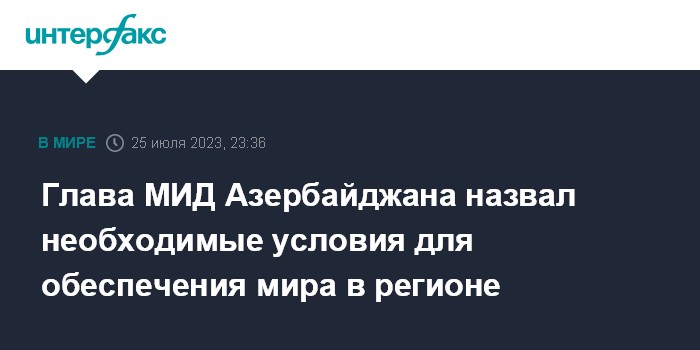 Москва. 25 июля. INTERFAX.RU - Министр иностранных дел Азербайджана Джейхун Байрамов назвал в числе самых необходимых условий обеспечения мира в регионе прекращение попыток помешать реинтеграции армян, проживающих в Азербайджане, и безоговорочное признание Арменией суверенитета и территориальной целостности Азербайджана.