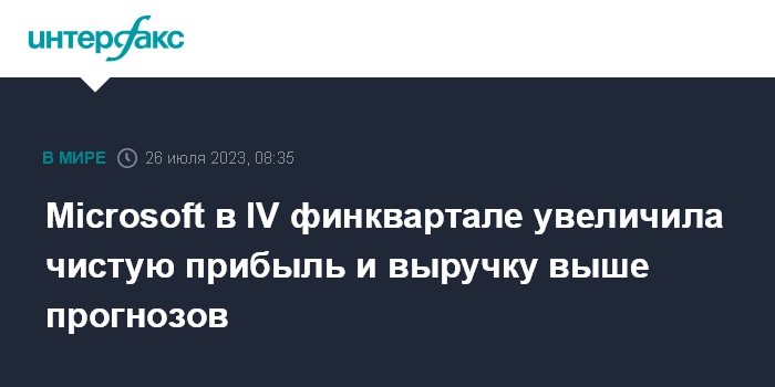 Москва. 26 июля. INTERFAX.RU - Microsoft Corp. в четвертом квартале 2023 финансового года увеличила чистую прибыль на 20%, выручку - на 8,3%, при этом оба показателя оказались лучше ожиданий аналитиков.