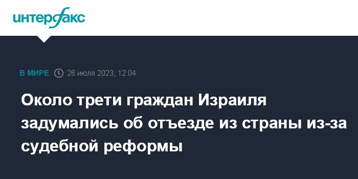 Москва. 26 июля. INTERFAX.RU - Около 28% граждан Израиля заявили, что рассматривают возможность уехать за границу из-за принятия судебной реформы, сообщает в среду The Times of Israel.
