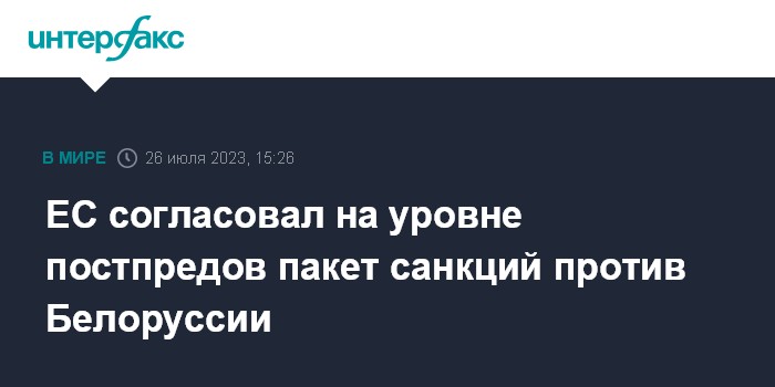 Москва. 26 июля. INTERFAX.RU - Постпреды стран Евросоюза согласовали введение нового пакета санкций в отношении Белоруссии, сообщается в среду в твиттер-аккаунте председательства Испании в Совете ЕС.