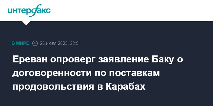 Москва. 26 июля. INTERFAX.RU - В Ереване опровергли заявление Баку о договоренности, достигнутой на встрече президентов Армении и Азербайджана и председателя Евросовета, о поставках продовольствия жителям Нагорного Карабаха по дороге Агдам-Степанакерт.