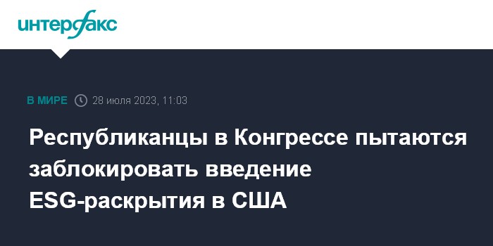 Москва. 28 июля. INTERFAX.RU - Конгрессмены-республиканцы внесли на рассмотрение Палаты представителей несколько законопроектов, призванных остановить введение в США требований по раскрытию информации об устойчивом развитии и продвижение инициатив, связанных с внедрением ESG-подходов на финансовом рынке.