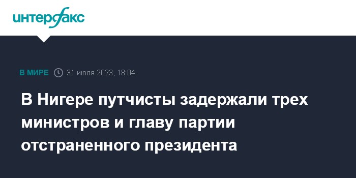 Москва. 31 июля. INTERFAX.RU - В Нигере путчисты в течение двух последних дней взяли под стражу трех министров и руководителя партии отстраненного от власти президента Мохамеда Базума, передают в понедельник европейские СМИ.