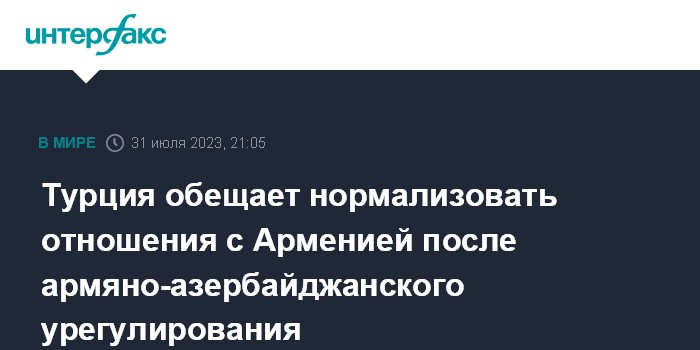 Москва. 31 июля. INTERFAX.RU - Турция нормализует отношения с Арменией после того, как Ереван подпишет соглашение о мире с Азербайджаном, и это может произойти в ближайшее время, заявил в понедельник глава МИД Турции Хакан Фидан.
