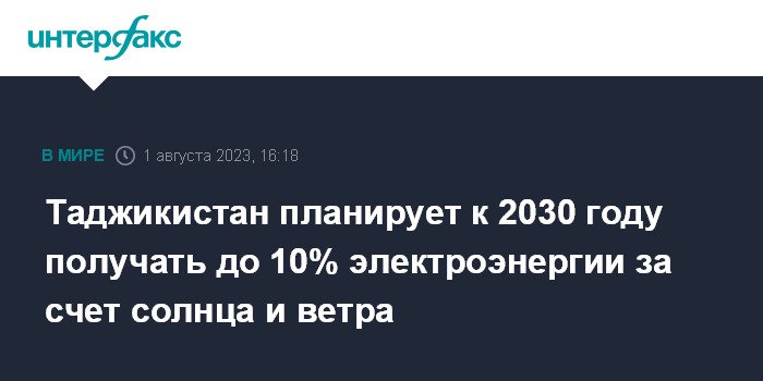Москва. 1 августа. INTERFAX.RU - Таджикистан планирует к 2030 году производить до 10% электроэнергии за счет возобновляемых источников, таких как солнце и ветер, заявил на пресс-конференции министр энергетики и водных ресурсов республики Далер Джума.