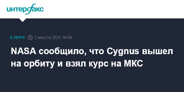 Москва. 2 августа. INTERFAX.RU - Американский грузовой космический корабль Cygnus компании Northrop Grumman, стартовавший к Международной космической станции (МКС), успешно вышел на орбиту, сообщило Национальное управление США по аэронавтике и исследованию космического пространства (NASA).
