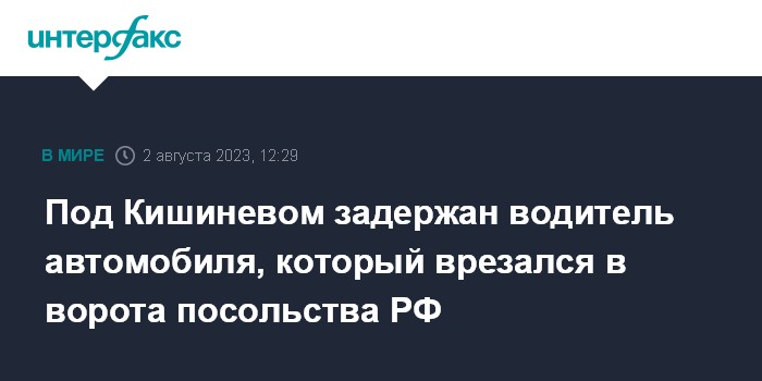 Москва. 2 августа. INTERFAX.RU - Полиция Молдавии задержала водителя автомобиля, который ранним утром в среду врезался в ворота посольства России в Кишиневе, сообщила пресс-служба Генерального инспектората полиции республики.